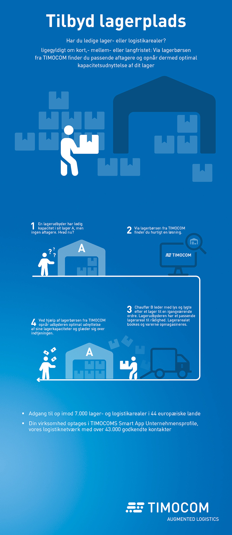 Har du et lager, og ønsker du at udnytte lagerarealet optimalt? Eller er du selv på udkig efter et passende lagerareal? Så har vi løsningen: Vores markedsplads omfatter også en lagerbørs. Lagerbørsen tegner sig for langt det største B2B-netværk af forskellige lagerarealer- og typer i Europa – og koster ikke ekstra. Som bruger af systemet får du automatisk adgang til mere end 9.000 lager- og logistikarealer i 46 forskellige europæiske lande. Alt efter dit aktuelle behov kan du vælge at modtage eller udbyde lagertilbud, hvorefter du kan kontakte dine potentielle forretningspartnere direkte.